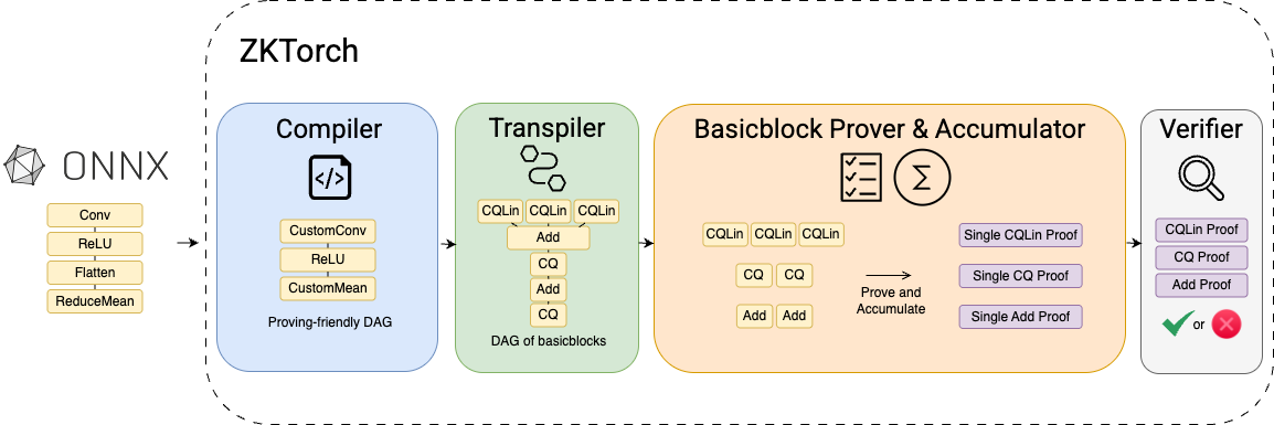 ZKTorch consists of three main components: a compiler, a transpiler, and a library of basic blocks. The compiler rewrites a machine learning model (e.g., an ONNX graph) into a proving-friendly directed acyclic graph, where each node represents an ML operation. For example, the GPT-J model provided by MLPerf Inference uses eight ONNX nodes to represent a single GeLU activation, requiring more than five lookup arguments to prove (each lookup allows us to prove that the elements of a committed vector come from a much bigger committed table). Our compiler consolidates these nodes into a single GeLU node, reducing the proof overhead to just one lookup.